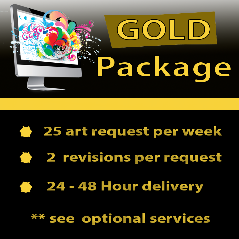 Gold art design package includes up to 25 art request per week with 2 FREE revisions per request - Delivery within 24-48 hours M-F. ** see optional cost below. **